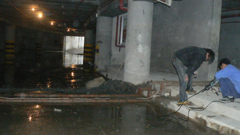 地下車庫使用時間久后,后澆帶有部分滲水現(xiàn)象,且越來越大,泥沙也一起沖出。公司技術(shù)人員根據(jù)現(xiàn)場勘察情況,經(jīng)過分析研究,采用“圍堵置換”工藝施工,在漏水點周圍2米處打2.5米深孔注漿,用以圍堵水源,同時把漿液填充到被沖出泥沙原部位,當(dāng)漿液達(dá)到一定濃度時,凝固成膠體,阻斷其它滲水源的進(jìn)入,同時,漿液在進(jìn)入滲水區(qū)域后膠凝,漏水通道也得到阻塞。經(jīng)過治理,再無滲漏。